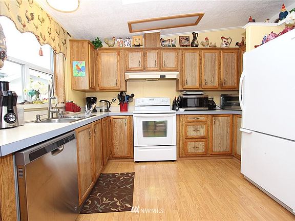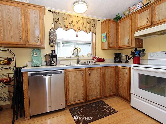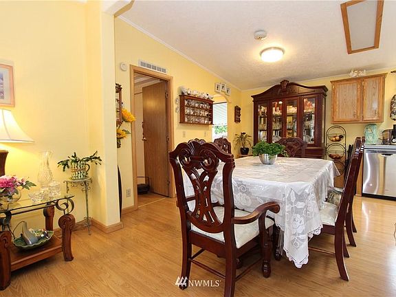 Very well maintained 3 bed, 2 bath home, vaulted ceilings with bright large windows. Functional kitchen with lots of cabinets, dinning room plus large living room. No carpet anywhere. new paint outside, covered parking lot for convenience. Storage shed stays. Close to shopping stores and I-5. This won't last. Buyer must be approved by the park. Club house available for this mobile home park. Current space rent $650.