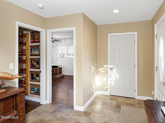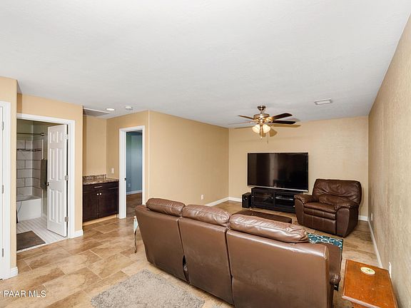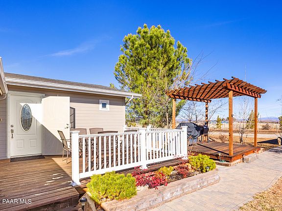Completely remodeled top to bottom and in a great central location, this home boasts panoramic views of the surrounding mountains including Granite Mountain, Mingus Mountains and the San Francisco peaks! The interior features a split bedroom great room concept floor plan with tile throughout the majority of the home, recessed lighting, vinyl windows, and raised panel interior doors. The newly redone kitchen showcases a stainless steel appliance package, massive island perfect for entertaining, and beautiful cabinetry with dovetail construction, soft close doors and drawers, and crown molding. Additionally, there is ample storage between the large walk in pantry adjacent to the kitchen and efficiency pantry in the kitchen itself. CONTINUE The spacious great room contains a wood burning stove with floor to ceiling stack stone accent and neutral paint scheme. The master suite is generously sized, has two walk in closets and outstanding views. The master bathroom features a raised height vanity with granite tops, new cabinetry, contemporary snail shower with floor to ceiling tile, jetted tub and comfort height toilet. The two guest bedrooms are generous in size and equipped with ceiling fans. The full guest bath features new cabinetry, raised height vanity, and tub/shower combo with tile accents. There is a 2 car detached garage as well as a 60x30 metal building/shop that can comfortably accommodate 3-4 cars boasts 10ft side walls 11ft center & 8ft doors. Additionally there is a 600 sq ft man cave, which is insulated, has wifi and a wood burning fireplace. The property is landscaped both front and rear and is fully fenced. Also located on the property is a chicken coop, greenhouse, and well house. The well house has 5,000 gallons of storage and is approx. 15gpm.