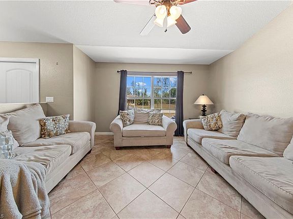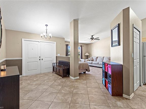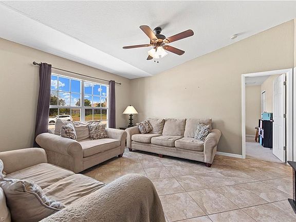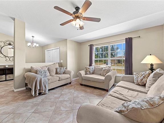 Welcome home!!! You are going to love the amount of living space you are getting at this price! This comfortable home features an open concept family room /dining room and kitchen, but also boasts a separate living area to help with space when entertaining, or separating family activities like movies vs video gaming! The split floorplan offers 3 bedrooms 2 baths and a 2 car garage. The main bath acts similarly to a jack and jill concept but is easily accessible for guests to use when visiting. The large master bedroom has sliders directly out to the large lanai and there is plenty of room in this yard to add a pool. The master bath offers separate tub and shower, private WC, and dual sinks! Every bedroom in this home has good size walk-in closets! Home offers tile in all living areas, and carpet in the bedrooms. The kitchen offers a self-cleaning oven, pantry, double basin sink, and a high top breakfast bar. On top of that, your budget will be happy with the fairly new AC unit, keeping your energy bills down! This home is conveniently located with easy access to Veterans and Pine Island Rd. Be sure to watch the 3D VIRTUAL TOUR and schedule you appt today!