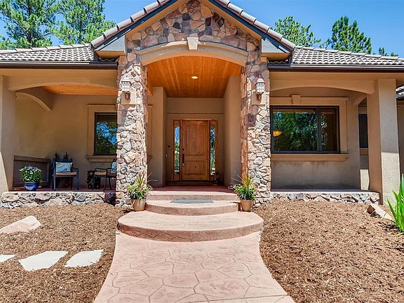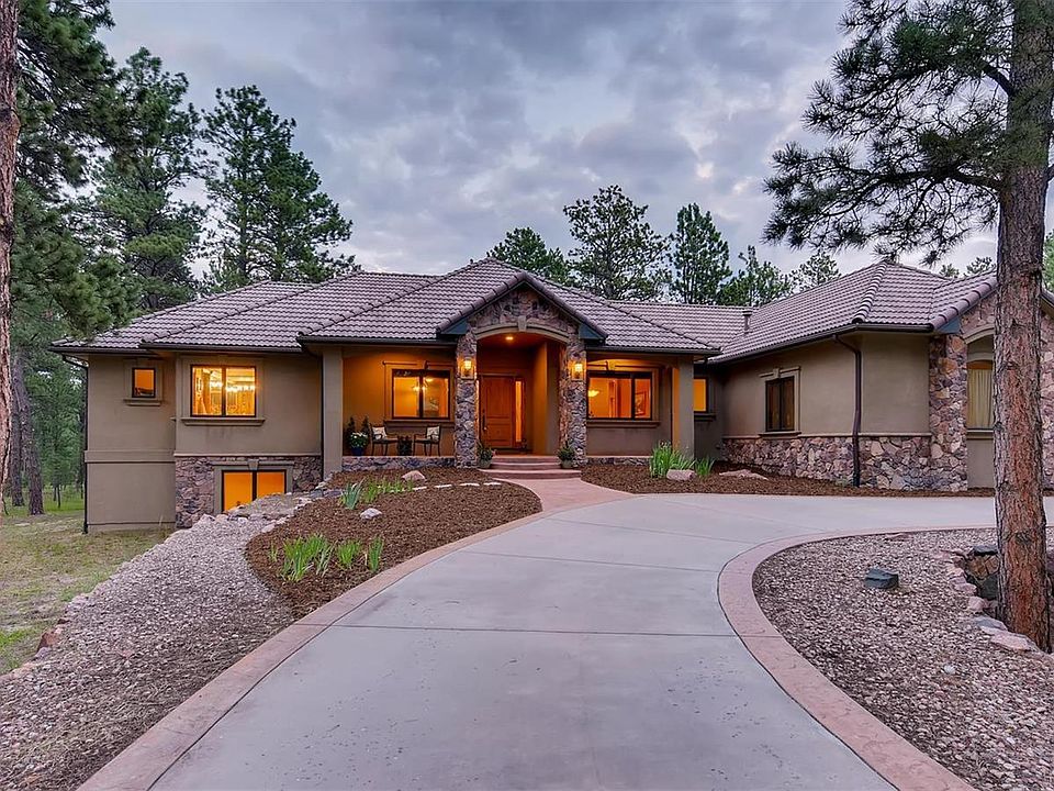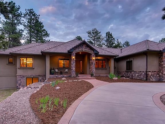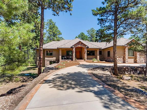 This prestigious, beautifully maintained home in Monument CO, is overflowing with upgrades and extras. It is nestled on 2.66 acres of well mitigated pine forest, just 2.5 miles to I-25 and close to Hwy 83. The large master suite is a private sanctuary with a fireplace and sitting area. The oversized walk-in closet and 5 pc master bath are a dream. Open concept living starts in the great room with a large fireplace and beautiful windows overlooking the forest. The kitchen has granite counter tops & custom knotty alder cabinets. There is an elegant formal dining room. New hardwood floors on the main. The basement boasts a great room with a fireplace, a separate home theatre & large wet bar. Two more bedrooms, a home office (opt 5th bedroom), large storage area & new laminate wood floors complete the basement. Upgrades include gutter guards, central vacuum, large shed, circle drive-way, 4 car garage, a well maintained septic, reverse osmosis water in kitchen, LED lights, many more.