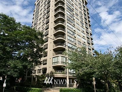 Stylish urban residence in the sky set among tree lined streets and historic mansions. Fabulously convenient spot. Skyscraper and Lake Union views loom large through the floor to ceiling walls of windows. Larger than a cafe table completely private deck. Corner unit. Concrete and steel building with only 4 units per floor. Building amenities: on-site manager, exercise and club rooms, sauna, guest suite, lush gardens and spacious main level patio. Secure parking. Air conditioning. Storage.