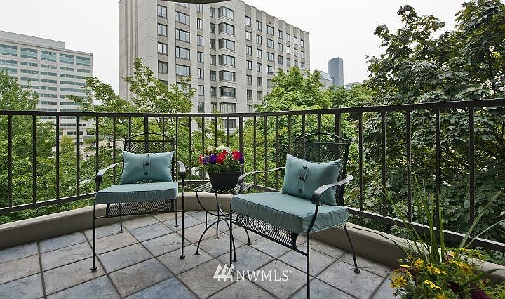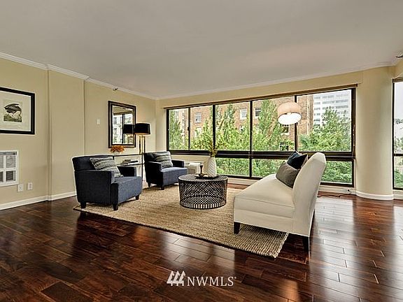 Looking over tree-lined streets and historic mansions of First Hill, this home offers new Acacia hardwood floors thruout, crown moldings, & the latest designer paint colors. Spacious floorplan, facing SW w/city views, natural light abounds. 2 bdrms, 1.5 baths, W/D, formal entry & dining rm. Private deck ideal for entertaining. Secure 1 car garage pkg & storage. Well managed bldg w/onsite manager, fitness center, guest suite, secure entry, concrete & steel bldg. Walkscore 98! Pristine condition.