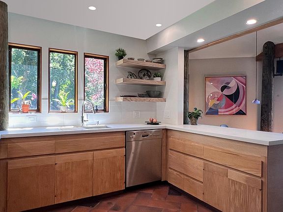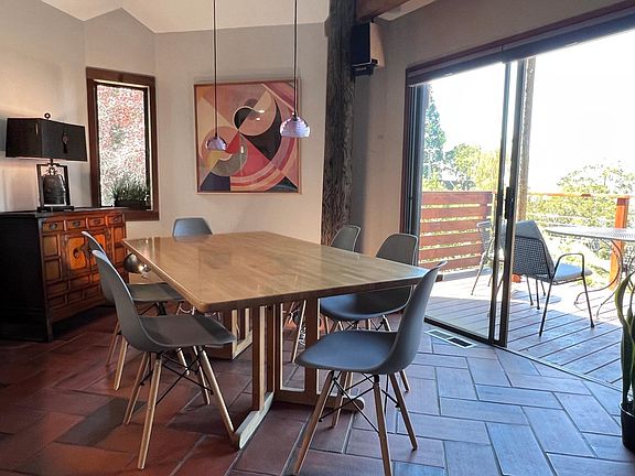 This is a fully furnished "suitcase ready" architectural gem located in the North Berkeley Hills available for long term rental. Built in 1976, the 3 bedroom 2 bath pole house sits at the head of a small canyon. Just a 7 minute drive to UC Berkeley the house is located on a quiet street and sits on a double lot providing a serene and peaceful setting (there are currently 3 bucks, a doe and fawn that live on the property). Panoramic views of the San Francisco Bay and Mt Tamalpais from the large west facing deck and windows throughout the house. Nearby expansive Tilden Regional Park is 3 minutes drive, or 5 minutes drive to shopping, fine dining, and cafes. This family home is fully operational with a well equipped gourmet kitchen (including cookware and dishware), completely furnished common areas and bedrooms 1st Floor: Open plan gourmet kitchen with updated countertops and appliances, eat-in breakfast nook, adjoining small deck Dining room with seating for eight, adjoining large deck with outdoor seating and expansive views of the SF Bay Multi level living room with listening/media platform, large picture windows facing SF Bay and Golden Gate Full bathroom with glass enclosed walk-in shower, new vanity Laundry room, washer, dryer, laundry sink 2nd Floor: Primary bedroom suite with king bed and integrated sitting area, generous closet storage Bedroom #2-with double bed and integrated work/study area Full bathroom with new double vanity, glass enclosed bathtub/shower 3rd Floor: Bedroom #3-Twin bed on main level, this room has additional loft with a second twin bed, couch seating and integrated workspace, amazing views of the entire SF Bay and Golden Gate Bridge from this top floor bedroom Utilities not included.