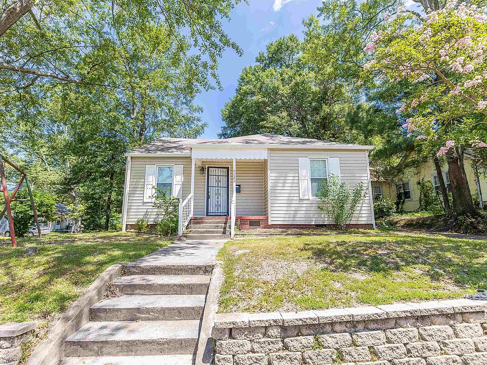 Charming home on an elevated corner lot, featuring a spacious kitchen, heightened ceilings, updated bathrooms, privacy fence, covered back deck, extra storage in the outbuilding, newer central HVAC, windows and roof, and easy-care exterior. The layout could easily accommodate the restoration of a 3rd bedroom if preferred.