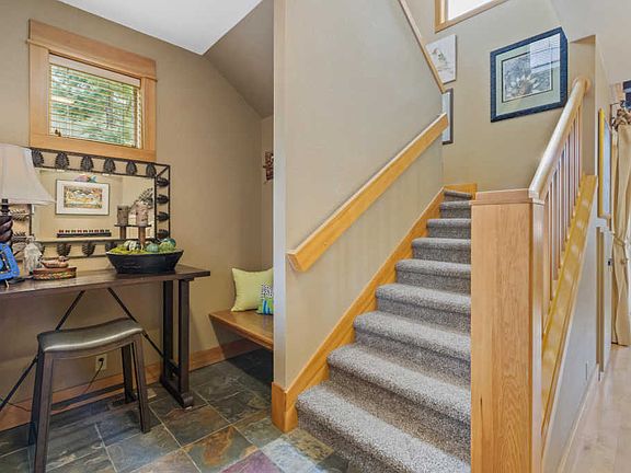 A wonderful Little Lodge, that is turn-key and beautifully furnished, is a perfect get-away or permanent home. Lots of natural light, with upgraded finishes that include timber-frame open beams, built-in-buffet, granite tile kitchen counters, hardwood, slate, tile, newer carpet and laminate flooring. Master on the main floor, with separate laundry room and half bath as well as under stair storage. Upstairs is the second bedroom and bath as well as an extended loft. French doors open to a bonus room that is currently used as additional sleeping quarters with beautiful custom built closet. This space would also be perfect for a home office, exercise room or flex space. Finished garage with heat/ac wall unit and attic storage with pull-down access. Enjoy a soak in the hot tub after the day's adventure. Corner lot, close to Lakeside sports center, walking paths and trails.