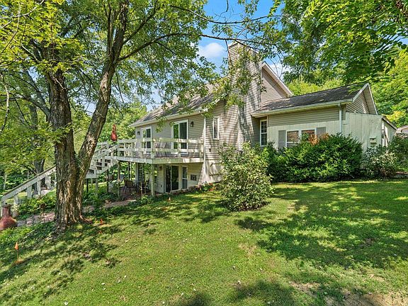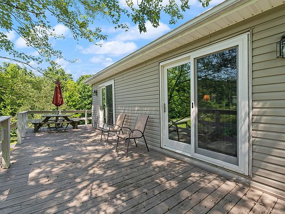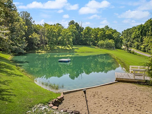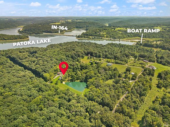 Patoka Lake home with pond on 3.83 acres, fruit and Walnut trees. A vast deck, the full length of the home over looks the pond. You can access this deck from the Great room, Dining area and the Primary bedroom on the main level. From every room in this home you have a view of the clear blue pond, walnut trees and the fenced fruit tree orchard. All the west side glass doors that face the pond and deck are lightly shaded with towering trees of Maple and Walnut. The pond has a sandy beach, a dock plus a floating swim platform that can be anchored anywhere on the water. This lake home has a lower level / partial basement with another sitting rooms, both with glass doors that walk out on the brick patio that also overlooks the pond beach, and landscape across the water. A wood burning simmering stove is perfect for cast iron cooking beef roast and stews, Ham Beans and corn bread. The home can also be fully heated with this stove in addition to the electric central heat and propane. So step on outside and walk a very short distance to the beach from any of the glass doors on both levels. The half upper level has an open loft and bedroom and is roughed in for 3 rd bathroom. On this loft you also can stop out onto an elevated deck to have morning beverage and watch the sun rise over the trees, listen to the wildlife wake up, start the day in this natural environment and the rest of your day will be perfect in this comfortable home. You also have propane fireplaces on two levels. This Dream Home can be reality for you. There are 5 three sided vehicle bays to park under roof. A sixed bay has a multi year supply of split firewood. This home also has propane fireplaces on two levels.