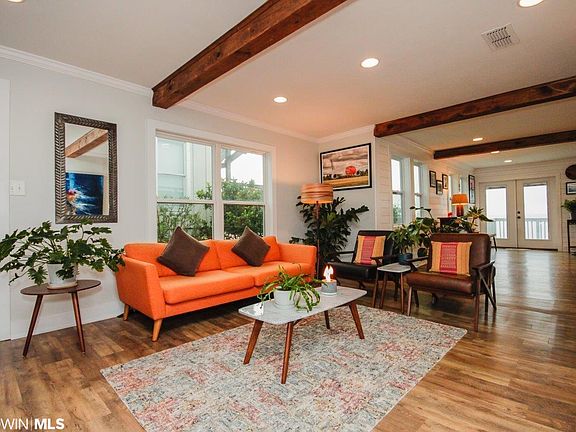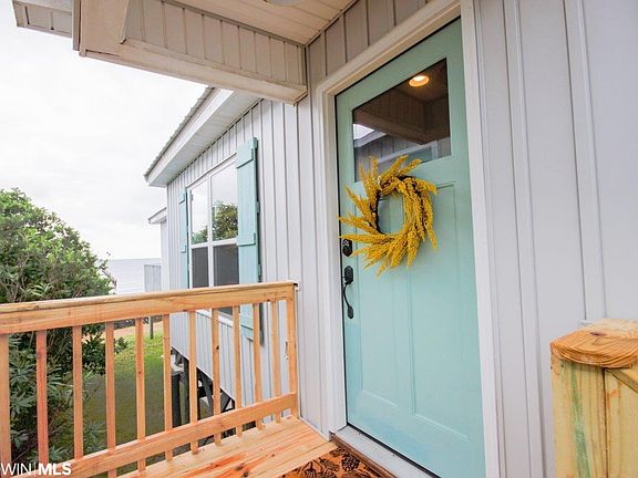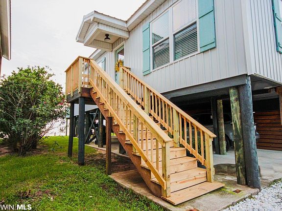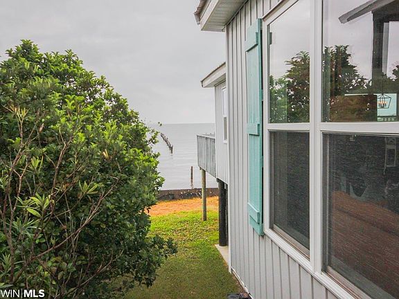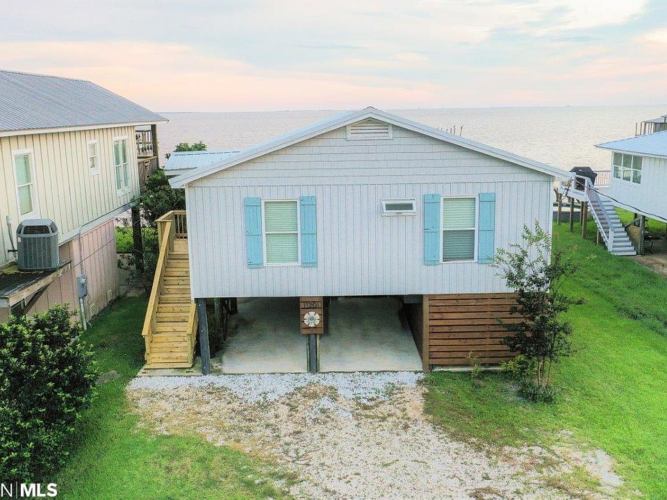 ***New vinyl bulkhead being installed September 2022.***Charming updated coastal cottage with beautiful Mobile Bay front views! Bay living at its best! Sit back and watch the sunset on the bay from your large open back deck or from the coziness of your living room sofa. Just 2 miles from the Pelican Point boat launch! LVP flooring throughout, tile in the bath. Very open floorplan between the family room, kitchen and breakfast rooms. Kitchen features quartz countertops, farm sink, Samsung stainless steel appliances, shaker style soft-close cabinets and a center island with breakfast bar. Home has updated lighting throughout, shiplap walls and beautifully exposed beams. 3 Bedrooms, two of which do not have closets, however, wardrobe furniture could be placed in each of these rooms for adequate storage, 2 bathrooms. The large hall bath has quartz counter tops, double sinks, a tub and shower combo. The smaller hall bath has a walk-in shower, new vanity and sink. Parking is no problem here with spaces under the house as well as a long gravel driveway. Storage space under the home and a sitting area for enjoying the sounds of nature on the bay. Board-and-batten vinyl exterior siding, city sewer and grinder pump and a new front stair entry way. All information provided is deemed reliable but not guaranteed. Buyer or buyer’s agent to verify all information.