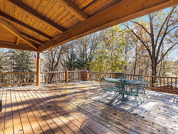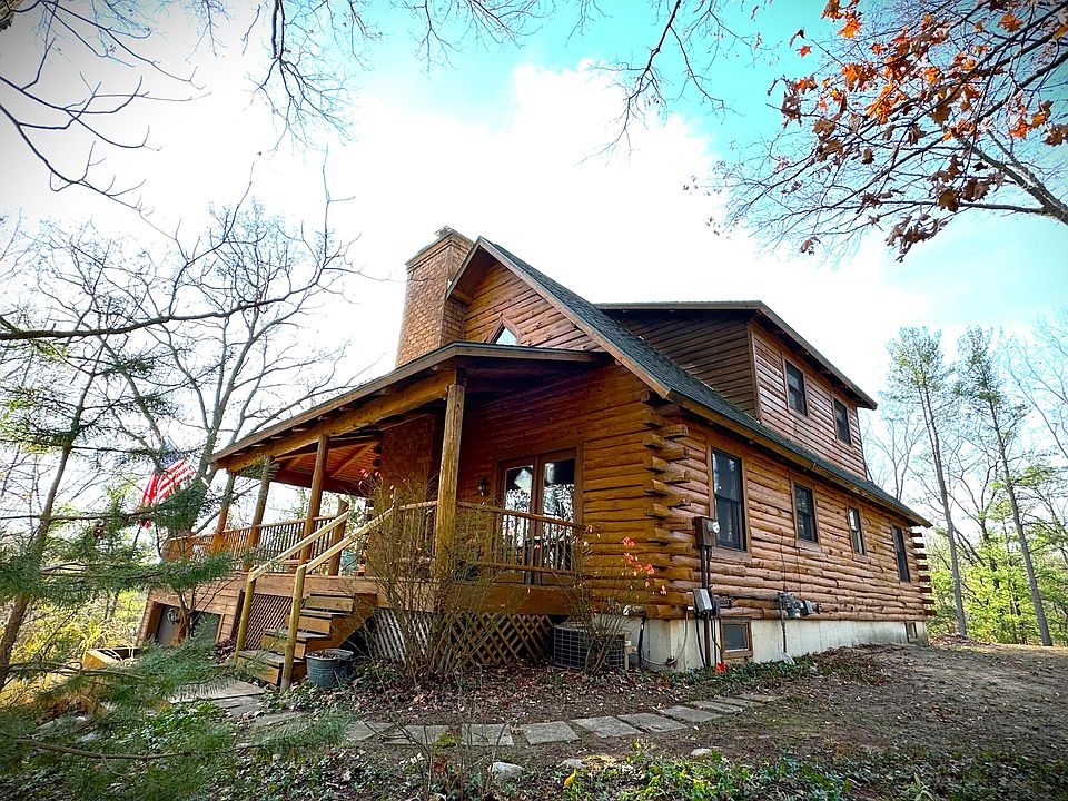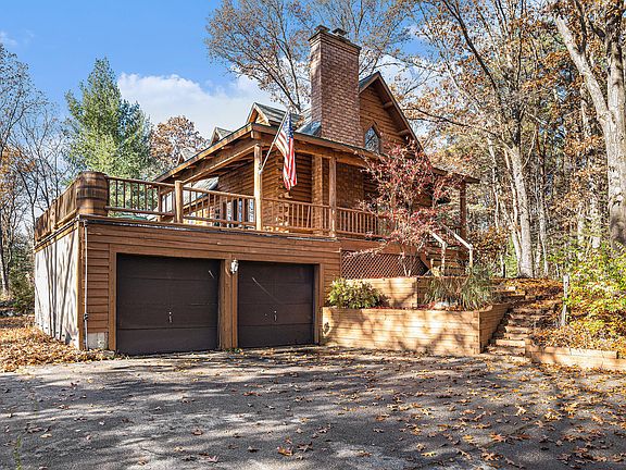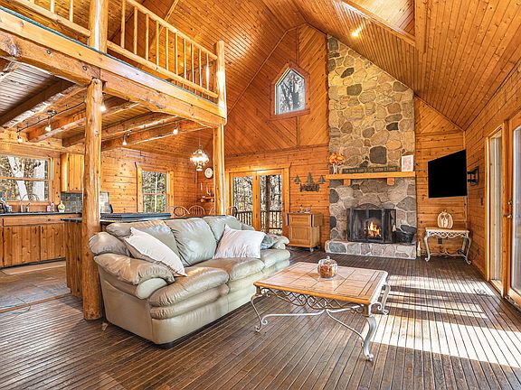 Perched atop a hill, surrounded by trees, sits a secluded homestead. This 3 bed, 2 bath log home sits on 2.15 acres abutting the White Pine Trail! An expansive wrap-around porch welcomes you and your guests home through a pair of French doors. The space opens up to a 2-story fieldstone fireplace, vaulted ceilings, wood floors, and custom woodwork throughout. The open kitchen features granite counters, a large island with a built-in stove and snack bar, stainless steel appliances, and slate flooring. The eating area overlooks the porch and property. 2 bedrooms and a full bath round out the main level. The master suite is up with its own private bath, walk in closet and loft overlooking the living room. Down, the finished rec room offers a wet bar and French doors outside, Laundry and a mud room area off of the 2-stall garage. Septic was replaced 2 years ago.