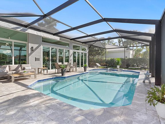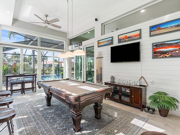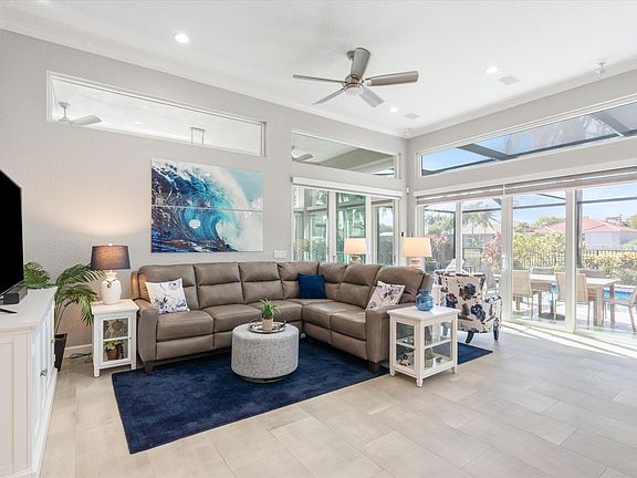 Welcome home!! New tile roof, impact windows & doors- installed 2021. Heated saltwater pool w/new enclosure. This meticulously renovated, single-level 4-bedroom home offers the perfect blend of modern luxury and serene lakeside living. With 12 ft. ceilings, expansive windows frame panoramic lakefront views, and allow the natural light to pour in. The spacious open-concept floor plan seamlessly connects the gourmet kitchen, dining, and living areas while providing ultimate comfort and style. Ideal for both relaxation and entertaining, this home boasts high-end finishes, thoughtful design, and ample living space all on one convenient level. The split floor plan separates guests/ children from the Primary suite. The custom designed Billiards room with floor to ceiling windows is a bonus! Improvements include: 2021 New tile roof, new impact windows and doors. AC, Billiards room/ Florida room enclosed, completely renovated, custom kitchen, floors, baths. 2023 Heated, saltwater pool with sun shelf just refinished and new deck and enclosure Custom details include 12 ft. ceilings through central part of house; 9 ft. ceilings in bedrooms Custom billiards room or 4 seasons room Quartz countertops, stainless steel appliances, marble backsplash, 3 pantries, soft pull drawers Central vacuum Remote blinds in great room Custom blinds throughout Workshop in single garage bay Porcelain tile throughout Separate customized laundry room Recessed lighting throughout Tray ceilings & crown molding Closets built out Garage built in workshop ADT Alarm System 2 Zone AC- 1 AC installed 2021 2 new remote-controlled deck awnings Hot tub is not included, but is negotiable ($13,000) Pool table is not included but is negotiable