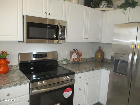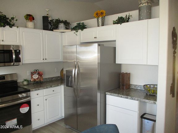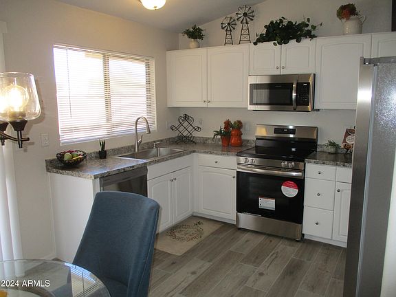 Located in the awesome subdivision of Barclays Suncliff this home is nice. Seller spared no expense in this great updated home. All new Kitchen with new appliances including Refrigerator and new sink new counter tops and some new cabinets too. New flooring in the Kitchen and both baths the home is all tile no carpet. New ceiling fans light fixtures window blinds and interior and some exterior paint too. Wow! Awesome backyard with extended patio and nice Ramada and shed too shows beautiful. This home has it all with great floorplan. Last things are the best things huge north facing corner lot with NO HOA and RV gate for all your toys possibly you can add guest house too. Located next to everything with shopping everywhere great school's minutes away from 101 and Cardinals Stadium.
