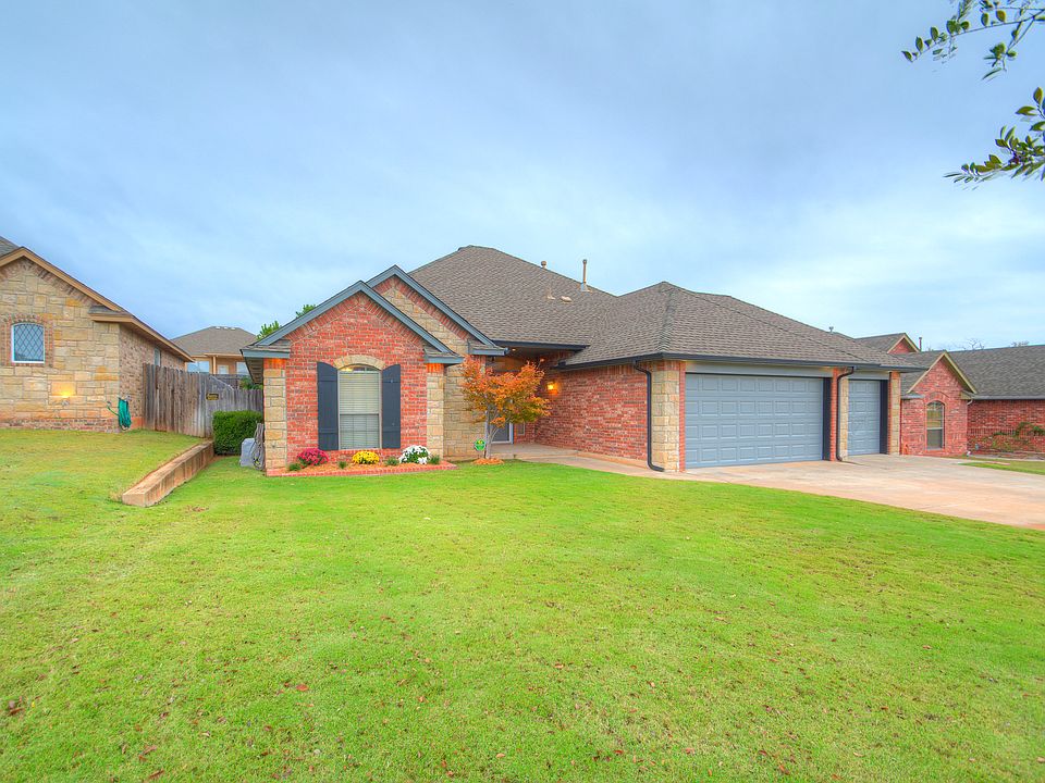 Beautiful landscaping and additional exterior lighting in front and back welcome you to this well-maintained Stone Creek home. The open floorplan makes for a comfortable space to enjoy time with family or friends. Kitchen has additional accent lighting and plenty of storage. Master suite boasts recessed ceiling, whirlpool tub and a large walk-in closet. Spacious storm cellar in garage floor is registered with the city. Experience outdoor living in this wonderful backyard escape or at the neighborhood pool. Covered patio, hot tub and deck with pergola and bench. Small shed in backyard is great additional storage. Exterior painted July 2015. Complete interior paint in October 2016. A/C unit replaced August 2013.