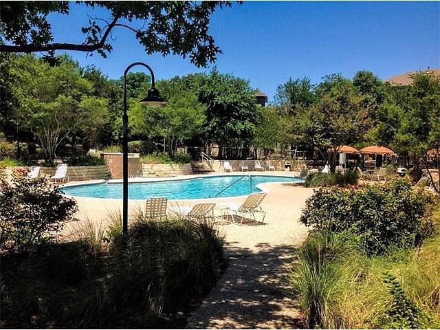 Rare 2 story floor plan with 2 car garage; end unit. Master is down with walk in closet; very nice bath with double vanity and Hollywood tub shower combination. upstairs has open floor plan with living, dining, kitchen, and study area all with Cherry wood floors. This property has fitness room, meeting room, huge pool, hot tub, grill; great amenites. Also, landscape is being redone soon and recent work to the driveways! Recent repairs to the sprinkler system.