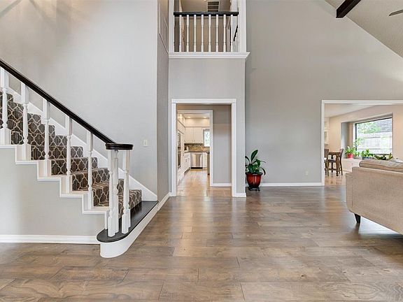 Inside, you’ll find fresh interior paint, soaring ceilings, and a spacious open-concept layout ideal for entertaining. The chef’s kitchen features a massive island, granite countertops, abundant custom cabinetry, and ample room for hosting. The main-floor primary suite offers a peaceful retreat with a spa-style bathroom, high-end finishes, and fresh carpet in both closets.