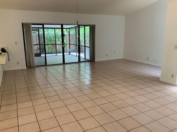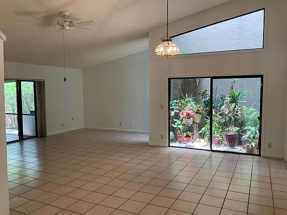 Unique one story end unit villa with 2 car garage. Situated on an oversized (6,425 sq. ft.) lot, larger than many single family homes. Features vaulted ceilings, an enormous 23x16 great room with a relaxing, lighted atrium loaded with plants, eat-in kitchen plus breakfast bar. Primary suite has a large walk-in closet, his and hers sinks in bathroom. Second bedroom has a built-in Murphy Bed. Step out to the spacious 24x15 roofed and screened patio. Interior laundry room with storage. Private backyard and garden loaded with fruit trees. Accordion storm shutters and doors. Guest parking close by. Low maintenance fee includes common areas, community swimming pool (2 minute walk), lawn cutting and tree trimming. Close to I-95, Turnpike, shopping, restaurants, grocery stores. Needs some updating