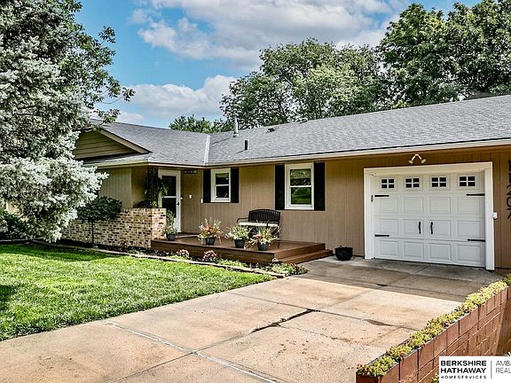 Just minutes from all Omaha has to offer this charming ranch home is waiting for you. The kitchen boast modern amenities expected in new construction. Updated kitchen cabinets with soft close drawers, farmhouse sink, newer stainless steel appliances and wine fridge, Quarts countertops, and beautiful back splash. LVP flooring has been installed through out the home to allow for seamless transitions. Large windows along the back of the home take in the beautiful tree lined yard. This home boasts amble storage spaces from closets, to 3 garages, as well as a storage shed. 3rd bedroom located in lower level walks directly out to large screened in patio. Need more parking? There's also a carport. Main floor laundry. AC 2021. All appliances and window coverings will remain with home. Nest thermostat and Ring to convey as well.