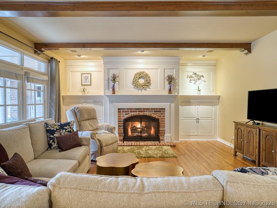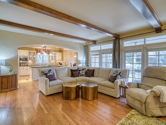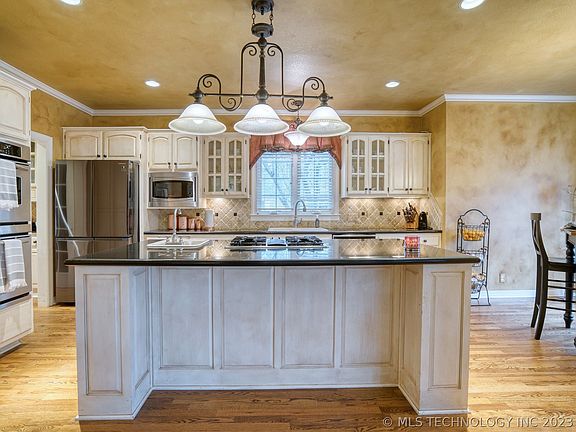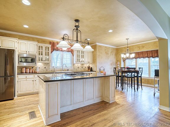 Gorgeous home in desirable Jenks southeast. Fantastic floorplan with master and office down, 3 bedrooms and home theater/5th bedroom upstairs. Chefs kitchen with exotic granite, SS appliances, large pantry, large living room with brick fireplace, and wine closet with rod iron gate, saferoom, fantastic backyard wit heated pool and hot tub. Outdoor kitchen with two fridges and built-in grill, covered patio. Perfect for entertaining. Corner lot with mature trees and 3 car garage.
