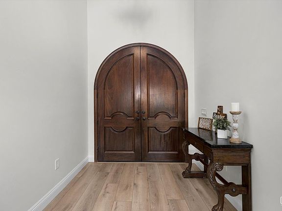 OWNED SOLAR with no True-up!! Exquisite residence nestled within the esteemed gated community of Brighton Estates. Upon entering the double front doors, you are welcomed by a meticulously designed split-wing floor plan that features elegant LVP flooring, tray ceilings and a formal dining area. The kitchen is a dream which includes quartzite countertops, double ovens, a farmhouse sink, an island with a prep sink, and ample cabinet space. The living room offers a built-in entertainment center and a cozy fireplace, complemented by large windows that provide a picturesque view of the pool. The spacious primary suite features an expansive walk-in closet, the ensuite bathroom is equipped with dual sinks, a soaking tub, and a separate walk-in shower. Outside to the thoughtfully designed outdoor retreat includes two covered patios, newer AC Units, a pool/jacuzzi, an outdoor kitchen and a gas fire-pit creating a tranquil sanctuary perfect for relaxation and entertaining.