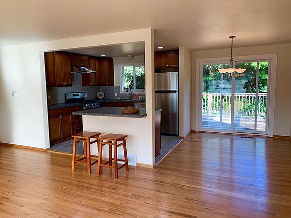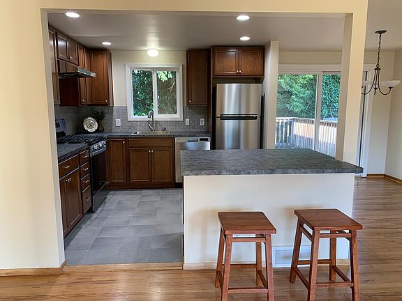 Edmonds Bowl on quiet cul de sac within easy walking to Downtown Remodeled kitchen and baths, new tile and refinished hardwood floors. Deck off kitchen and dining area. Family room and large 4th bedroom on lower level. Spacious laundry room and large 2 car garage Tenant pays for utilities. No smoking Strong credit rating Application fee