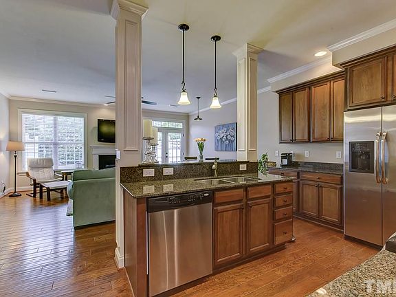 Immaculate, Move-in Ready 3-Story Townhome! Fresh Interior Paint! Hardwoods & Crown on 1st Floor! Kitchen hosts Stainless Appliances, Granite Counters, Tall Cabs w/Crown, Center Island w/B'fast Bar. Open Concept Living/Dining w/Fireplace & French Door to Patio. Master BR w/WIC, Dbl Granite Vanity, Tile-Surr Shower & Soaker Tub. 2nd BR also has a WIC and Attached Full Bath. 3rd Fl Bonus w/WIC,Storage Doors,& Plumbed for Bath. Patio w/Privacy Fence on Both Sides. Close to I-40, RDU, Shopping, and Much More!