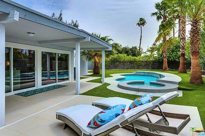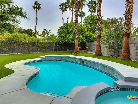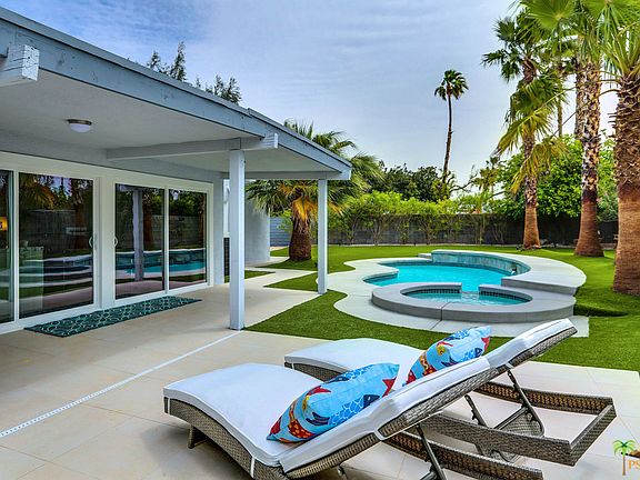 Stunning, sexy, and thoughtfully updated and upgraded home in a quiet cul-de-sac near central Palm Springs. No expense was spared on the 2018 ~$200,000 renovation, from the lavish open concept new kitchen with high end appliances, including a wine fridge, to the exquisitely finished baths. The large living and dining area offers a dramatic feature wall with an encased fireplace. Gleaming floors carry throughout the home. The new pool and spa, and lush yet water saving landscape, make the yard both beautiful and easy to maintain. Multiple patio spaces offer plenty of outdoor lounging and entertaining options. Enjoy the mountain views and private backyard. This home is ready to move in!