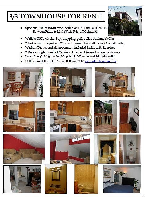 * Spacious 1400 sf townhouse located at 1121 Eureka St. 92110 * Walk to USD, Mission Bay, shopping, golf, trolley stations, YMCA (off Friars Rd) * 2 Bedrooms + Large Loft * 3 Bathrooms (Two full baths, One half bath) * Washer/Dreyer and all Appliances included inside unit, Fireplace * 2 Decks, Bright, Vaulted Ceilings, Attached Garage + space for storage * Currently undergoing renovation - new kitchen, paint and carpet * No pets Neighborhood Description Walk to USD, Mission Bay, Fashion Valley shopping mall, golf, trolley stations, YMCA (off Friars Rd)