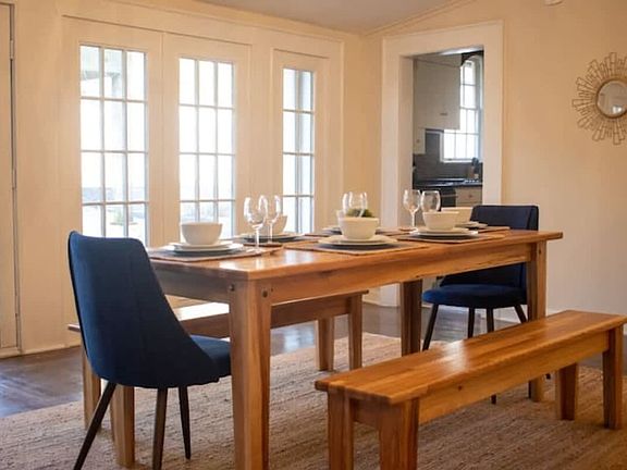 Step into this timeless house where history whispers through its walls. The living space captivates with high ceilings, mirrored walls, crown molding, and fireplaces. The living room features a queen sofa sleeper, a fifty-inch Roku TV, two armchairs, and a futon. The master bedroom offers a plush king bed and a cozy futon. The fully equipped kitchen includes a dishwasher, stove, refrigerator, toaster, blender, and coffee maker. Adjacent is a dining area with a six-seat table, futon, and armchair. Additional bedrooms feature queen beds and futons, ensuring ample space for larger families.