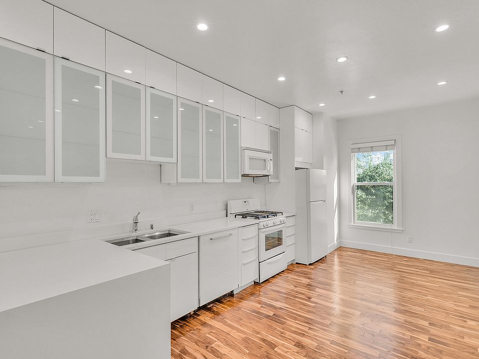 This "must-see" condo basks in natural light from numerous windows throughout an open floor-plan. The condo features beautiful hardware floors and sleek, modern European kitchens with granite counter tops and tons of cabinet space. The gourmet kitchen has a huge island with storage space underneath. The condo also features recessed lighting, high-end kitchen and bath fixtures, and a stackable washer/dryer in the unit. The three spacious bedrooms are equally sized and can all fit king beds + have large mirrored closets with built-in dressers. The condo has two full baths, one with a large, luxurious shower stall, and one with a shower over a tub.