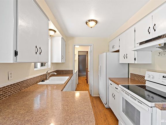 This rambler is clean and ready for you! Quaint kitchen with all appliances and small eating bar. Access off of kitchen to both laundry and bathroom. The wood burning stove/fireplace has a cozy slate hearth surrounded with retro stone. New carpet and large bedrooms! Sliding door leads to outdoor space ready for your ideas. Plenty of parking and room for RV/toys on this corner lot.