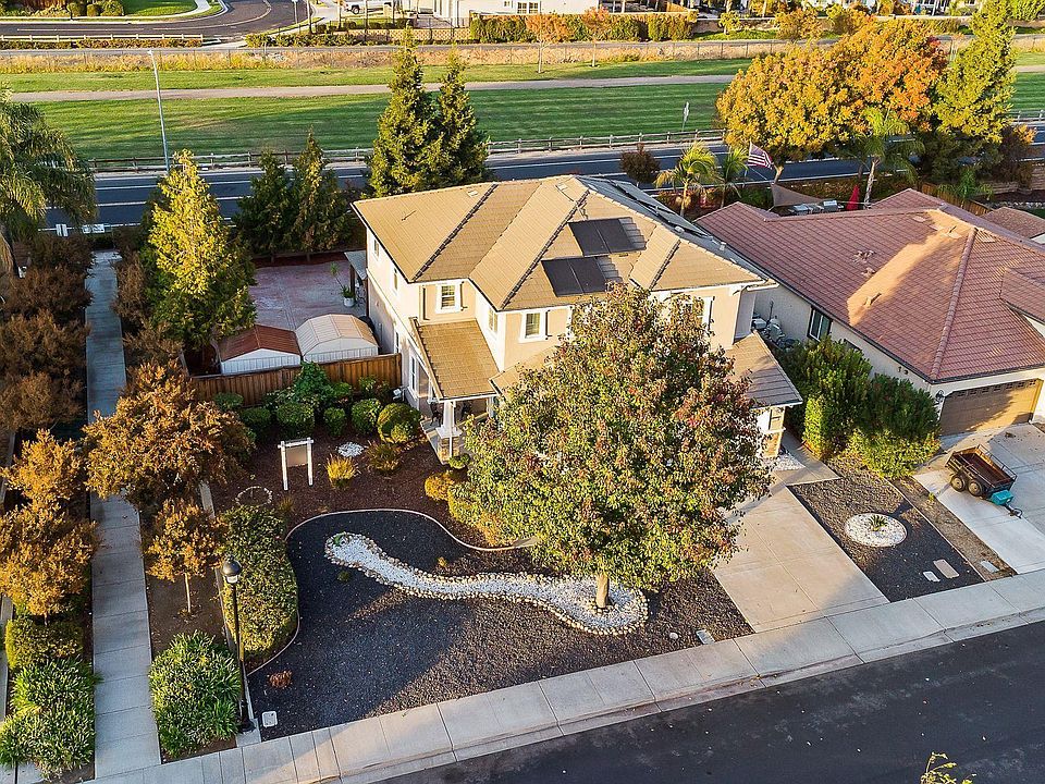 This stunning residence features an open floor plan that's perfect for entertaining, nestled in one of the most sought-after neighborhoods. With 4 generously-sized bedrooms plus a versatile den/office on the main level that can easily serve as a 5th bedroom, this home offers space and flexibility. Vaulted ceilings create an inviting atmosphere, while a beautiful formal dining area flows gracefully into an expansive kitchen, complete with rich wooden cabinetry and elegant stone countertops. The living room seamlessly connects to the well-maintained backyard, ideal for gatherings. Retreat to the oversized primary bedroom, this spacious sanctuary is the perfect place to unwind after a long day. Step outside to discover a large lot that features a gazebo, two storage sheds, and ample space for outdoor activities, including potential RV parking. Enjoy the privacy of no rear neighbors, along with the bonus of a walking path on the side of the home. As you enter from the garage, you’ll find a convenient mud room with built-in cabinets, perfect for keeping your home organized. With owned solar panels that are free and clear, enjoy energy efficiency and savings. Located within walking distance of Elementary Schools and Parks, this home checks all the boxes!