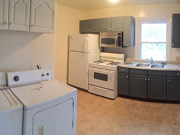 Two bedrooms, living room, kitchen, bath, and walk up attic. Tenant pays all utilities and is responsible for snow removal. Includes stove, refrigerator, washer, dryer, and central A/C