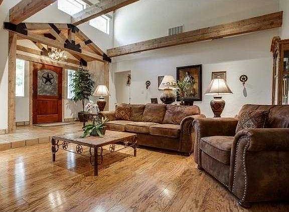 REDUCED!! Enjoy Country living in 1 story home with gated entry. Completely updated with granite counters, updated bathrooms, recent carpet, recent AC replaced, paint, vaulted ceilings and media room with ALL EQUIPMENT. Morning coffee in sun room just off the Master. Open floor plan and split bedrooms, Pool with flagstone patio, fire pit area, and trees! Separate workshop off garage, barn, and porte-cochere for 3-4 cars. New appliances added