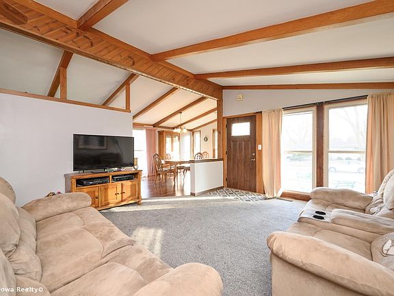 Over 1700 SQ FT finished with beautiful vaulted ceilings and wood beams in this one-of-a-kind ranch home Two family rooms on main level with large window in one and gorgeous fireplace & hardwood floors in the other. Dining room is very spacious and can hold a very large table with additional furniture such as hutches. Door between kitchen and dining room leads out to outdoor patio space. Three spacious bedrooms with updated 1.5 baths complete the main level. Updates in the home include hardwood flooring and carpet, windows, roof, & driveway. Lower level is large and one room already has the ceilings/walls drywalled. Newer egress window installed in lower level for future bedroom as well.