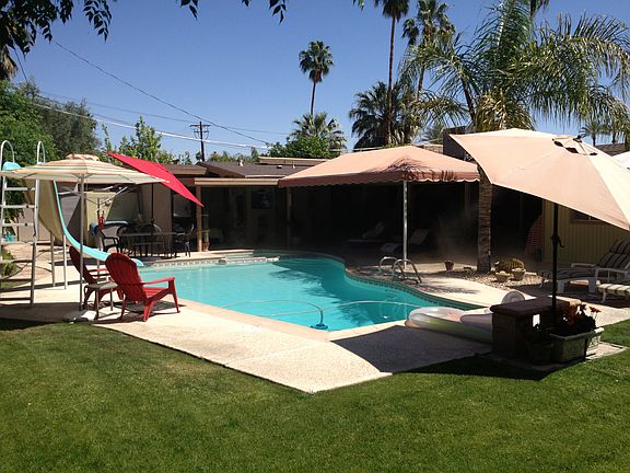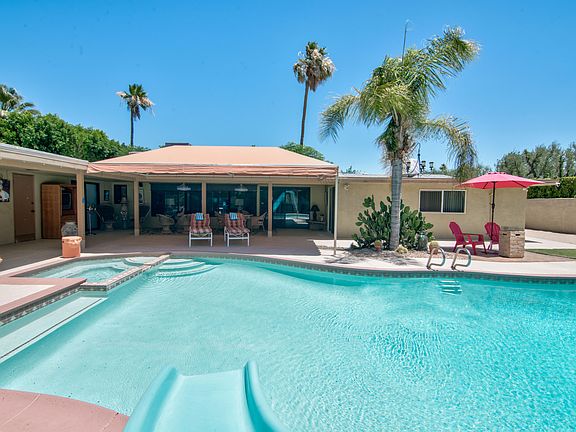 Check out this private 4 bedroom mid-century ranch style home in South Palm Springs that offers a large west-facing backyard, wide views of Mt San Jacinto and quick access to downtown Palm Springs! Exceptional value for this neighborhood and as an added bonus there are no HOA nor land lease fees! The galley kitchen has stainless appliances and a casual dining area that opens to the west-facing living room that offers views, gas fireplace with a stone front, and a sliding glass door that opens to the large covered patio complete with a Koolfog misting system as well as the private backyard anchored by a saline pool and spa, outdoor fire pit and views of Mt San Jacinto. Master bedroom offers a high vaulted ceiling, mountain views, direct access to the west-facing backyard, a large walk-in closet and a private bath with dual sinks and a walk-in shower. Bedroom Two and Bedroom Three, which offers high ceilings and clerestory windows, are both near a hallway bath that has a shower/tub. On the other side of the house is Bedroom Four which offers views and opens to the private backyard. Solar system, attached two car garage plus a two car carport and side area for your RV!