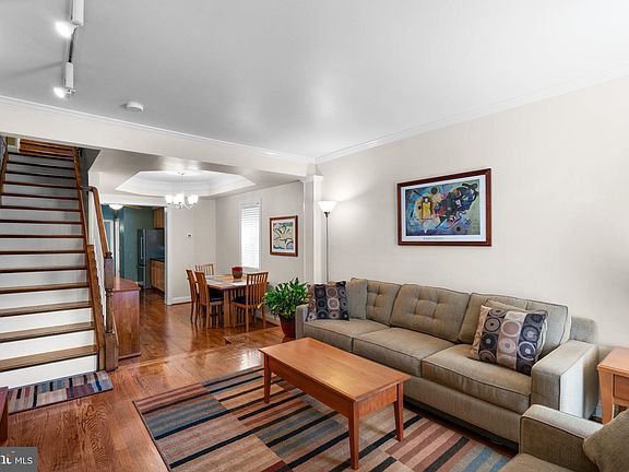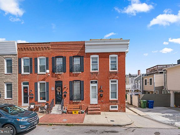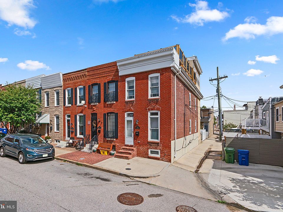 This gorgeous 4-level end-unit townhome offers a perfect blend of modern style and historic charm. Boasting beautiful hardwood floors across three levels, exposed brick walls, and crown molding in the family room, this home exudes elegance. The tray ceiling in the dining room adds a touch of sophistication, while the galley kitchen features granite countertops, stainless steel appliances, including a gas range, and a door leading to a parking pad or use as a private patio area with the unique removable privacy fence. Natural light fills the home, thanks to the extra windows provided by its end-unit location. The main level includes a convenient half bath, coat closet, and laundry area. On the second level, you'll find two bedrooms and a full hallway bath, including an owner's suite with an ensuite bathroom. The rear bedroom on the second level offers direct access to a deck. The third level offers an additional bright and spacious room with a wet bar, refrigerator, and a sliding door that leads to the stunning bi-level rooftop deck with expansive city views—perfect for entertaining. The basement provides ample space for storage. Located just blocks from Canton Square and the harbor, with dining, shopping, and entertainment all within a short distance, this townhome combines city convenience with luxurious living. Don't miss this unique opportunity!