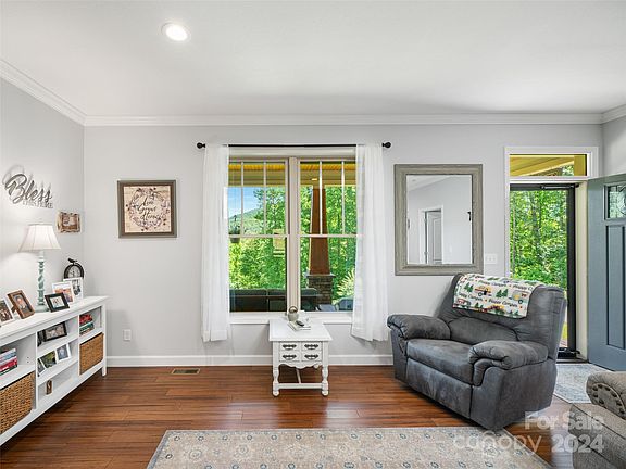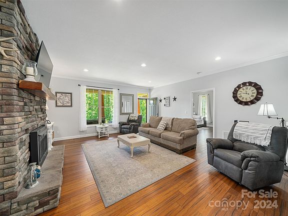 This home, built in 2017, features one level living with front and back porch, paved level parking with a 2 car garage for easy access convenience. The 6+ acres offers privacy, views, walking trails, an additional potential building spot, lovely landscaping and flower gardens, and a large detached garage for a workshop and a covered RV parking shed. The full basement is large and suitable for a play area, workout space, and storage. The wood stove offers heat for the winter and will also heat the entire main floor if so desired. Main level living has everything you need for comfort and convenience with a large primary bedroom with ensuite and 2 large guest bedrooms and additional full bath. The spacious kitchen and dining area can accommodate several cooks in the kitchen. The large living room is versatile for furniture layout around the beautiful fireplace to complete the feel of a mountain retreat. So convenient with access off a state maintained road.
