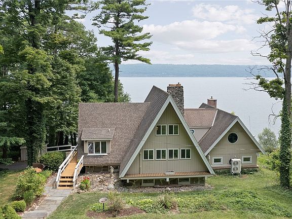 Live the lake life you’ve always dreamed of, where eagles soar past your sliding glass doors and just 75 steps lead to your private lakeside yard, dock, and boathouse on Cayuga Lake. Wake up to dazzling sunrises, enjoy coffee or cocktails on expansive decks, and take in unparalleled views through three stories of soaring windows that frame the water from every living area. This custom contemporary chalet blends style and charm and has been thoughtfully updated with quality materials and an eye for design that pays homage to life on the water. You’ll find unique touches throughout—stained glass windows, a loft walkway to an office crowned by a dramatic round window, warm wood cathedral ceilings with exposed beams, and stone fireplaces. Bedrooms on each level offer privacy, while the primary suite pampers with its own fireplace, walk-in closet, and spa-like bath featuring a freestanding soaking tub and separate shower. The sleek kitchen, with “U” shaped island, quartz counters, stainless appliances, and slate floors, flows easily for entertaining, to a deck and into the great room addition with a loft for extra living or creative space. Four fireplaces invite year-round comfort, while gardens, slate staircases, and quiet sitting spots make the outdoors as enchanting as the inside. A renovated 2-bedroom guest cottage provides income or extra space for friends and family who won’t want to leave. With rare privacy, yet just minutes from town, restaurants, wine trails, and all the Finger Lakes have to offer, this is more than a home, it’s a retreat, a gathering place, and a front-row seat to lakefront living at its finest.  Square footage is per photographer's iGUIDE tour.
