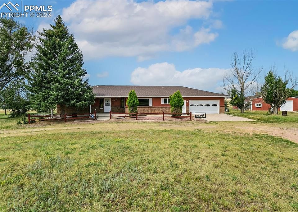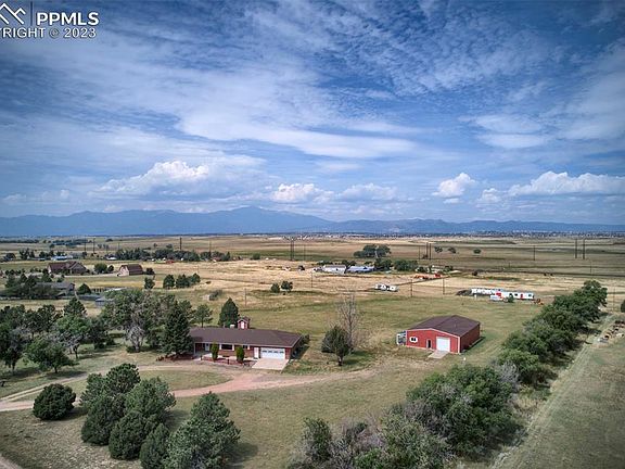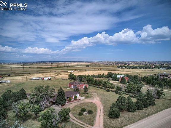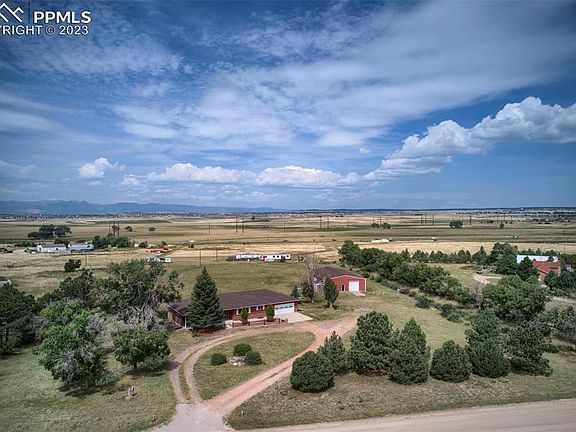 5-ACRES OF COUNTRY LIVING CLOSE TO FALCON WITH AN AMAZING VIEW OF PIKES PEAK! Enjoy your privacy on this great lot and still be within 5 minutes of amenities in Falcon and only 15 minutes to Peterson SFB. This nearly all brick home has 5 bedrooms and storage space galore! The main level features a private office area with French doors, master bedroom with adjoining 4-piece bath, guest bedroom, half bath, country kitchen, separate formal dining room, huge laundry/mud room with cabinets and sink, and living room with a free-standing gas heat stove. Living room opens to the kitchen and has a walk out to the covered deck to enjoy those amazing mountain views and iconic Colorado sunsets! Garden level windows in the basement bring in lots of natural light to this home. The basement level offers an expansive family/rec room with a Shrader wood stove and has a perfect area for a card/game table or reading nook with beautiful wood built in cabinets/book shelves. There are 3 bedrooms in the basement (one oversized), a full bath, plus 2 unfinished storage rooms. This home has good sized closets in every room and lots of them! New carpet in the master bedroom, living room and oversized bedroom in the basement. Attached garage has a newer garage door and LOADS of cabinets and storage space. Looking for indoor storage for your RV or toys or want a heated garage and workshop area? This property has a huge detached building offering everything you need! Half the building is a finished garage/workshop area with a concrete floor, large overhead drive-in door, built in cabinets & workbenches, and a propane furnace to keep you warm while you work on your projects during the winter. The other half of the building has plenty of space to store an RV (or 2 or 3!) and has 3 drive-in doors (12'x13'; 9.5'x13"; 10'x10'); or bring your horses and turn this half into a barn. There is also a 7'x16' greenhouse and a separate 8'x9' garden shed. Don't miss out on this great property!