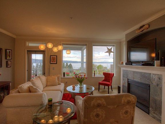 Amazing Unobstructed Views of Lake Washington! Sitting right across all Lake Washington has to offer, this huge 3 bed/2 bath home is large & full of light! Great-room concept with sleek & stylish kitchen that opens up to dining & family room w/ gas fireplace. Corner end unit-beautiful windows take advantage of the gorgeous view from almost every room! Huge covered patio, full laundry room & stunning entry! Secure bldg w/ garage & carport. Steps from "The Landing,"& Coulon Park, & 405! See today!