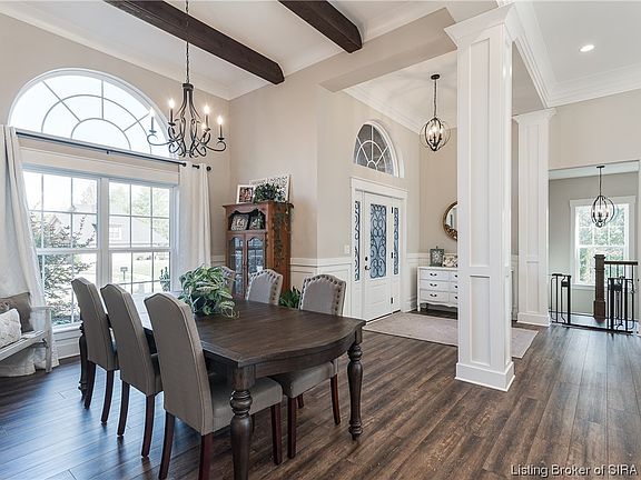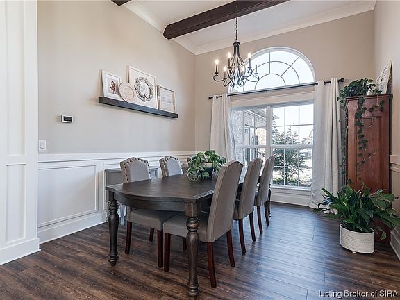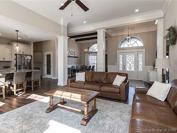 Beautifully situated on a GORGEOUS culdesac lot, this all brick "Avanti" Plan was constructed by ASB Homes in 2020 and is located in Covered Bridge Golf Community, for which is one of the most prestigious neighborhoods in Southern Indiana. This home boast 4 bedrooms, 3 full baths, 3 car garage and is on a very large and private lot with a beautiful wooded backdrop that you can enjoy year round from the inside or enjoy on the covered back deck. With a wide open floor plan offering a true foyer, formal dining room, large great room..all with vaulted ceilings, this home is perfect for entertaining guest or just spreading out with family in your day to day. The kitchen is open to the great room and has an 8ft granite island, granite composite sink, touch faucet. backsplash, and stainless steel appliances. The primary suite is a comfortable haven offering views of the trees and includes an en suite bath with dual sinks, custom tile shower, large soaking tub, and walk in closet. In the lower level you will find a whole other living space with the 4th bedroom, family room, full bath, theater/flex room, UTILITY garage, tons of storage and the capability to walk right out to the back patio. Some upgrades include; tankless water heater, upgraded trim package, and dedicated gas line to grill on back deck. Lastly, this home is just minutes from the clubhouse that overlooks the golf course and includes bar and dining!