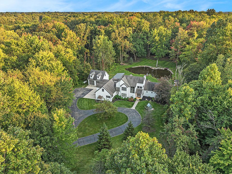 This is the one you've been waiting for - luxury living meets serene country charm at this executive retreat set on 10 private acres! With over 3,500 finished square feet, this home is perfect for both entertaining and relaxation. The open-concept main living area boasts vaulted ceilings, creating an airy, inviting atmosphere full of natural light. The expansive kitchen offers plenty of cabinet and granite counter space, a walk-in pantry, and center island with wine rack and breakfast bar seating. The dining room is open to the spacious family room and flows effortlessly to the screened porch and Trex deck, offering the ideal indoor/outdoor lifestyle. The primary suite is also on the main level, complete with a generous walk-in closet; private full bath with two vanities, soaking tub, and separate oversized shower; and access to a private deck. An office/sitting room and laundry/mud room complete the entry level. Upstairs are two more bedrooms that share a hallway full bath, plus a flex room that could be a game or bunk room. A finished lower level provides additional space for games and movies. Outside, the heated in-ground pool with cabana and wet bar is perfect for summer gatherings, and there's ample lawn space for games and outdoor fun. This exceptional property also offers a stocked pond, a mile of wooded trails, several firepit areas, and abundant wildlife, making it the perfect escape for outdoor lovers. Freshly painted inside and out, with new landscaping that enhances the natural beauty of the property. Keep your vehicles and toys clean and dry with an attached 3-car garage and detached 2-car garage with 220V electricity and attic storage. Conveniently located near highways for commuters or quick weekend getaways, this property offers peace, privacy, and endless opportunities for recreation and relaxation. Loads of recent updates - newer appliances, fiber internet, furnace/AC, pool equipment - for your peace of mind and enjoyment. Don't miss this special home!