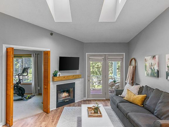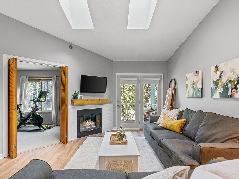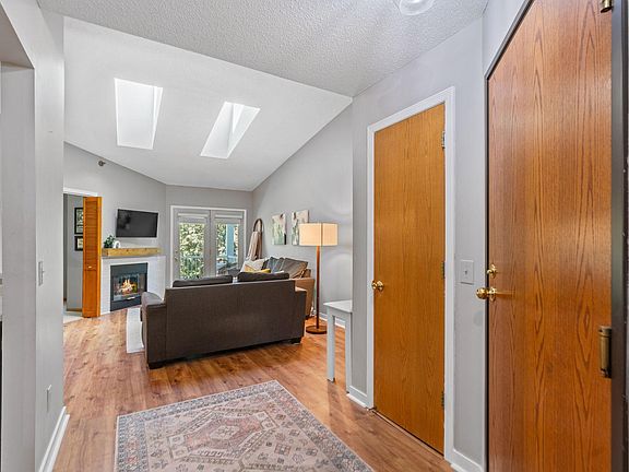 This stunning two-bedroom, top-floor unit features vaulted ceilings, skylights that flood the space with natural light, and an open concept layout. Recent updates include a new AC, lighting, bathroom update: vanity/mirror/lighting/paint, washer/dryer, vinyl flooring, microwave, garage opener, and freshly painted cabinets. The spacious kitchen offers ample counter space and a pantry, seamlessly flowing into the dining and living rooms with a cozy gas fireplace. Step out onto your private balcony to grill dinner or relax by the community pool during the summer. The unit also includes a one-car garage and plenty of guest parking. With proximity to Dred Scott Field, walking trails at the Wildlife Refuge, and convenient highway access—this one has it all!