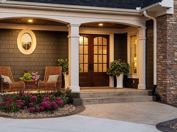 Upstairs, you’ll find two oversized en-suite bedrooms, each with walk-in closets. The home’s thoughtful design includes main-floor office, laundry, mudroom and a three-season porch overlooking a private, tree-lined yard on nearly a half-acre.