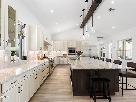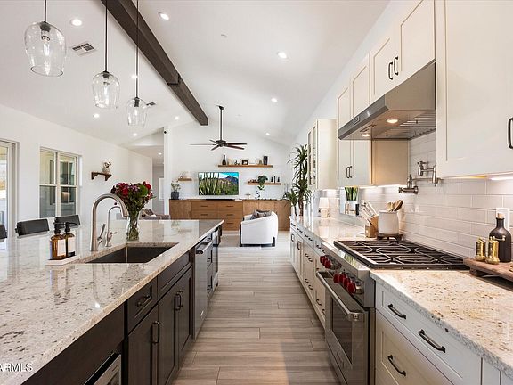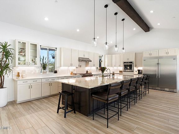 Nestled in the prestigious Sundown Estates of Scottsdale, this stunning 5-bedroom, 3-bathroom + bonus room estate was masterfully designed and built in 2019 for seamless indoor-outdoor living. The expansive great room features 16-ft vaulted ceilings and dual 4-panel sliding glass doors, opening to multiple covered patios. Enjoy breathtaking Camelback Mountain views from the south-facing patio, complete with a cozy gas fireplace and built-in seating. The north-facing backyard is a private resort oasis, featuring a newly remodeled pebble-sheen pool with Baja shelf seating, all-new Pentair equipment, and travertine decking, with ample space for dining, entertaining, and play. The gourmet kitchen is a chef's dream, boasting a 14-ft island, Wolf 36'' dual-fuel range, Frigidaire Professional fridge/freezer, and a massive walk-in pantry. The formal dining room with custom built-ins and the game room with a beverage fridge/bar provide exceptional spaces for entertaining. The private owner's suite features a luxurious bath, a spacious walk-in closet, and direct backyard access, while Bedroom 2 enjoys an ensuite bath, walk-in closet, and pool views. Additional highlights include a custom-built drop zone, generous laundry/craft room, and a 4-car garage with extra storage and a potter's work area. Sitting on nearly an acre, the lot extends past the block wall, offering space for a casita, sport/pickleball court, or additional garages. Ideally located near top-rated schools, premier shopping, dining, and freeway access, this home offers the perfect blend of luxury, privacy, and convenience. Don't miss this rare opportunity.