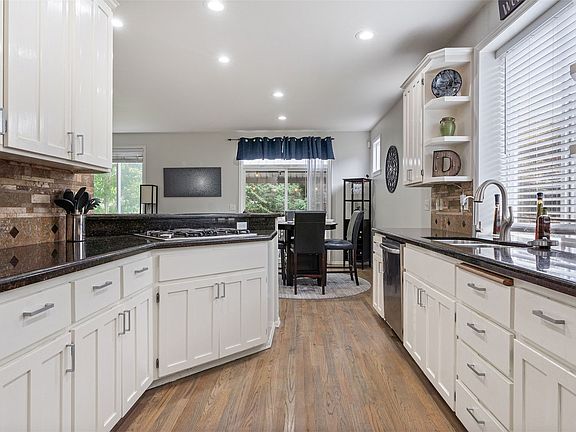 Beautiful, well-maintained home w/ 4 beds + office in fantastic neighborhood w/walking trails. Soaring architecture greets you in the entry with a formal dining room w/butler's pantry to the right. Kitchen has granite counters, stainless steel built-in appliances, & walk-in pantry. Large office on the main floor could be a 5th bedroom. Primary bedroom has ensuite 5-piece bath and walk-in closet. Fourth bedroom is ENORMOUS and could be used as a family room. Enjoy outdoor dining on the covered deck with a view of the large yard. Yard backs up to a greenbelt, and there is an access road on the south side, which provides lots of privacy. Upgrades: refinished hardwood floors, new AC and furnace, newer appliances & carpet, custom Xmas lights.