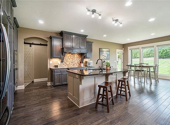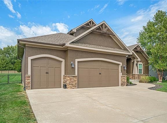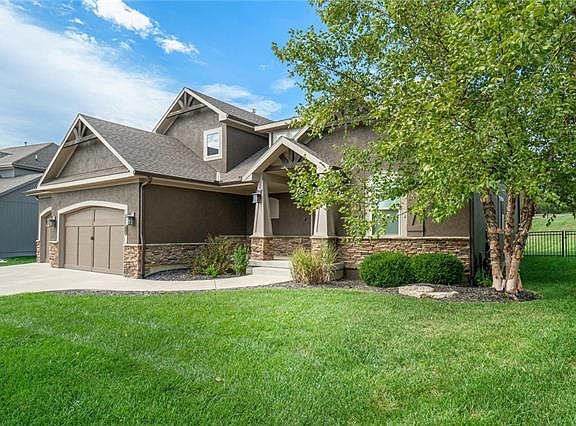 Welcome to your Gorgeous 1.5 Story Home, complete with SO Many Unique Features. This Former Model Home, was a Parade of Homes Award Winner for Distinctive Plan and Design! This Sprawling Floorplan Boasts Luxury Finishes throughout every room. The Living Area Boasts Vaulted Ceilings, Gleaming Hardwoods and a Beautiful Stone Fireplace. Open Concept Chef's Kitchen, Quartz Counters, and a large Walk-in Pantry. Main Level Master Bedroom, with Large Walk-in Closet. Master Bathroom with Double Vanity, and Tiled shower with Rain Shower head. Utility Room on the Main level features a Gorgeous Barn door and Mud Area. Cute Half Bath on the main level, as well as an Office Room with Custom built-in cabinetry and desk overlooking the backyard! On the second Level, you'll find 3 Bedrooms, a jack-n-jill bathroom and another full bathroom. Large hallway overlooks downstairs and is complete with an office area w/ a built-in desk. An Entertainer's Dream Full Basement, with Living Area, a Full Bar that features a Reclaimed Wood Backslash, and 5th Bedroom and Full Bathroom. Covered Patio backs up to Green Space, Perfect for Relaxing or Entertaining. Fantastic Neighborhood, with Walking Trail, Splash Pad, Fishing Pond, it's perfectly located close to major highways, schools, and all the restaurants and shops that Olathe has to offer! Everything in this Home was Upgraded and Customized to the Highest Standard, it's Spectacular! It's been Meticulously maintained. You can't miss this one!