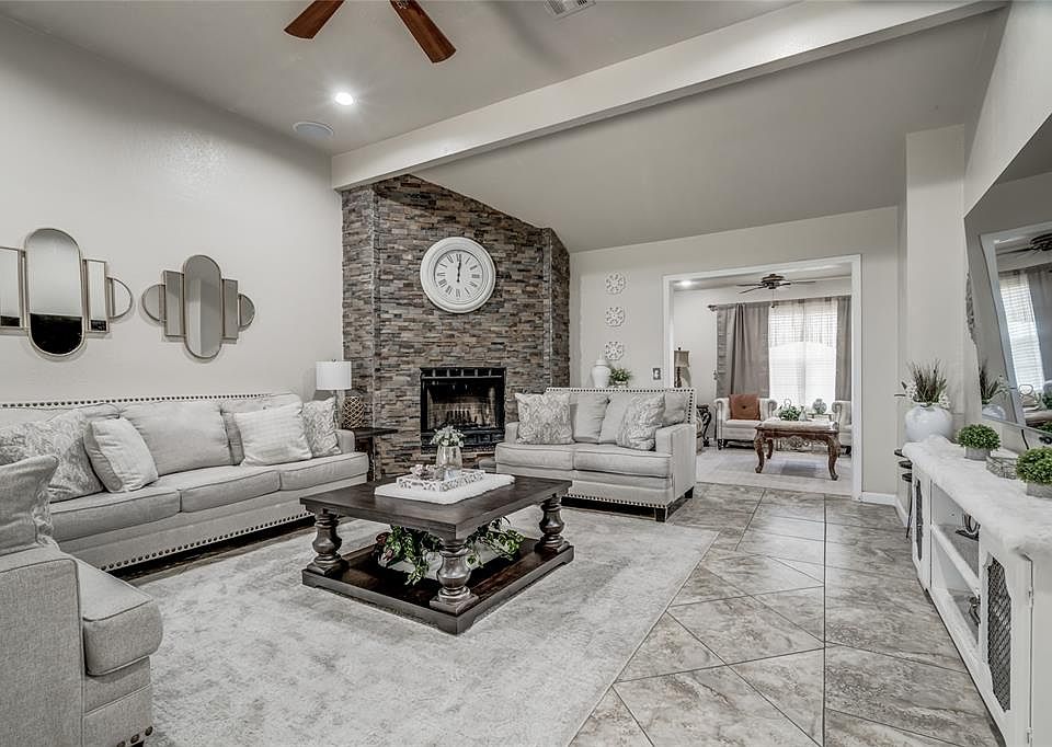 BACK ON THE MARKET AT NO FAULT OF SELLERS!!! Tastefully updated interior and exterior, located conveniently close to the Turnpike, NW highway and Putnam City North High School. Enjoy the homes surround sound system, two dining rooms, and two living rooms, making it ideal for entertaining. All bedrooms are very spacious! The primary bedroom is extra large and includes an en suite bathroom with 2 sinks and walk in closets. The seller updated the exterior of the home with new stone, new siding and 6-head sprinkler system. The interior updates include all new bathrooms' faucets and fixtures, the fireplace, the interior's tile and vinyl plank flooring, and the hot water tank in 2019. The garage has built in cabinets great for the handy person in your life!