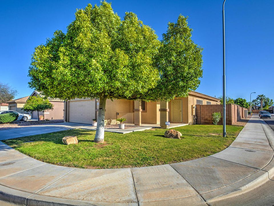 Awesome home in Crystal Point in Avondale, AZ. Corner lot home with 4 bedrooms and 2 bathrooms. Great Room Floorplan. Home has vaulted ceilings throughout for an nice open feel. Carpeted in 3 bedrooms, hardwood flooring in 4th bedroom used as office. Backyard is set up for outdoor kitchen with gas and water hookups. Yard has raised planter bed with pavers, green grassy front and backyards. Sunscreens on most windows, mature trees and shrubbery. New interior Paint. This home has hard to find Gas Oven/Range. Lots of cabinet space in Kitchen. Come take a look, you will LOVE it!