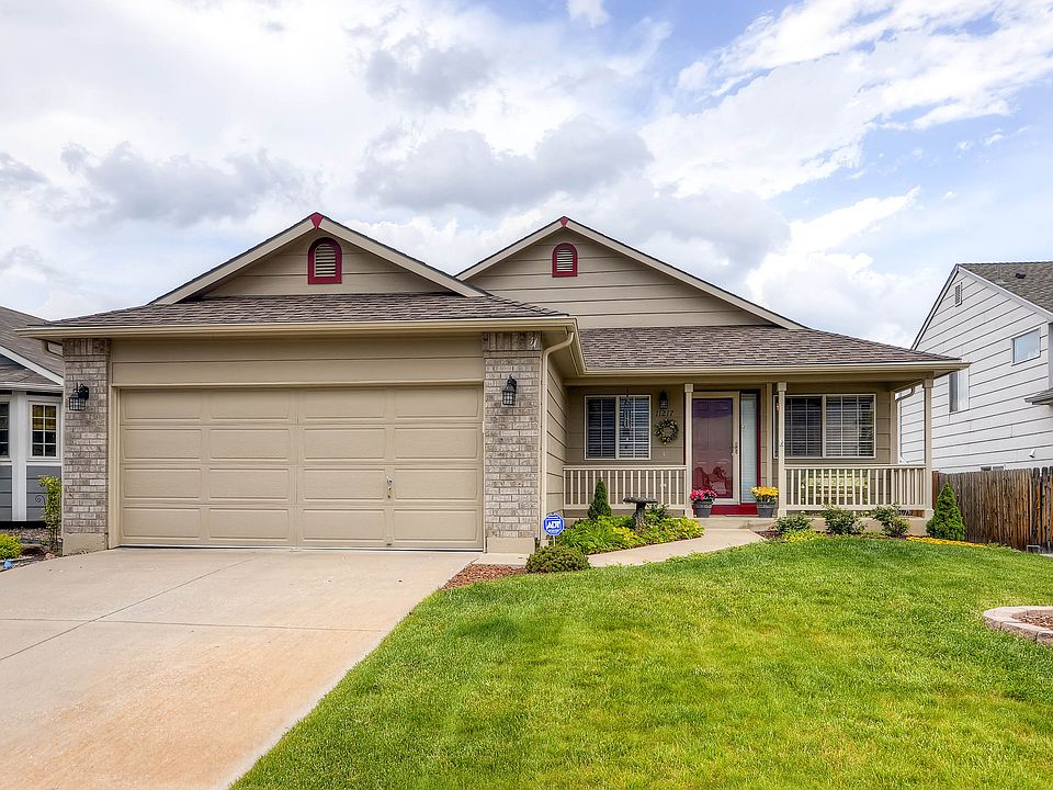 Relax on the front porch or rear deck of this impeccable ranch home adjacent to open area in Sunrise Creek. Bright open floor plan includes vaulted ceiling, large kitchen with pantry and island overlooking living area. 3rd bedroom can also serve as a study, main floor laundry. Large entertainment area in beautifully finished basement includes wet bar. New improvements include, int/ext paint, engineered flooring in kit, blinds on main level, hot water heater, furnace humidifier, garage door opener, rear landscape with sprinkler system, security system and much more!! Stop by the open house Sat 6/13 1-4pm