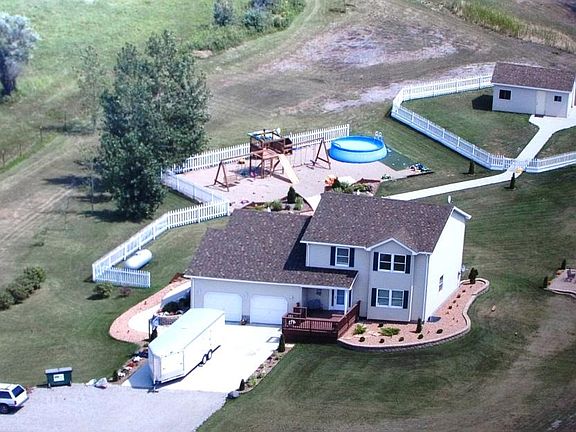Nice 2-story built in 1994, 5 acres, double attached garage, front & back decks, patio, shop, playground, volleyball, fire pit, lots of new flooring, main floor family room w/gas fireplace - door to deck. Formal dining & eat-in kitchen. 4 bedroom, 3 bath, finished basement w/2nd family room + den (or office) & bedroom. Landscaped, Central Air.