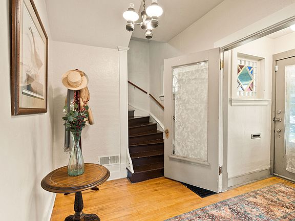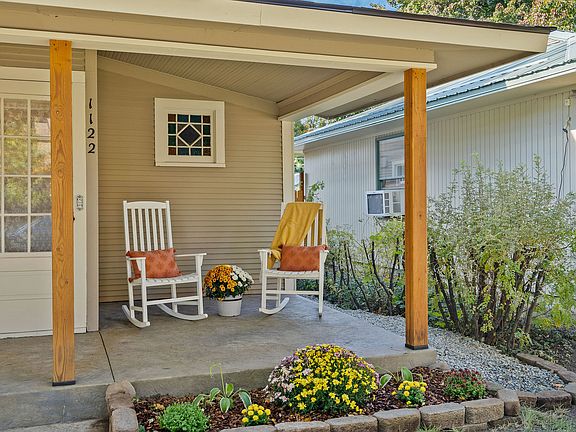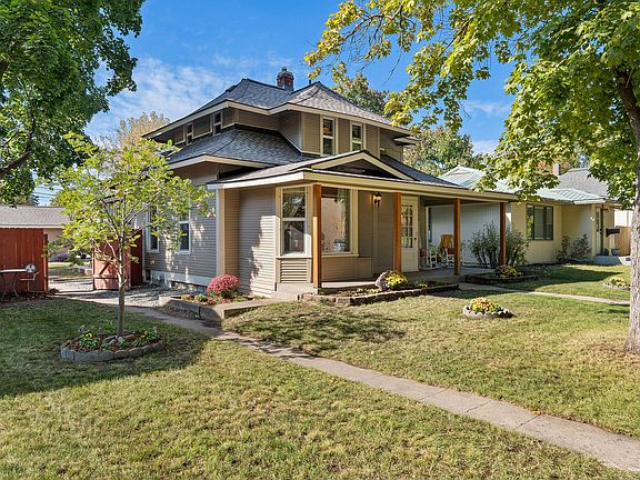 The Walker House. National Register of Historic Places 1910 Prairie-style home features a hipped & gabled roof w/Japanese-inspired wide flared eaves that are unusual in Kalispell, 2 diamond shaped stained glass panes in the front porch, bay window & small dormer make this home incredibly unique .Entering this 1-1/2 story craftsman bungalow you feel the charm of early Kalispell with it's period architecture. The main floor has foyer,dining room,1 bedroom (with built-ins that have a fun hidden door to basement),kitchen,living room & family room addition.Upstairs there are 2 bedrooms & a full bath.Multiple fresh updates include new carpet,exposing original hardwood floors,exterior & interior paint, roof,new historic redwood siding on west end of home & landscaping.The 868 sq ft basement hosts the laundry room (w/ chute from kitchen),additional room (no window),vintage insulated canning room & more clean, dry storage. Private, fenced back yard w/ new deck, detached 2 car garage & parking.